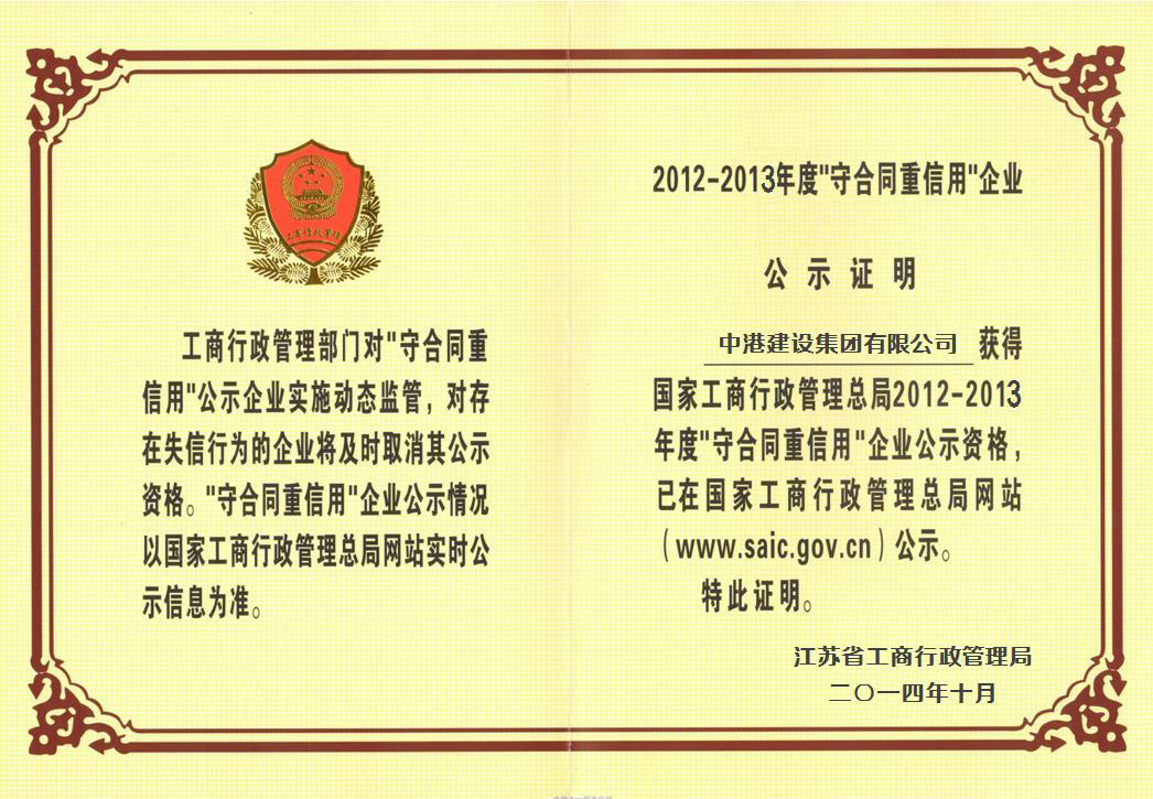中港建设集团上榜国家工商总局2012~2013年度“守合同重信用”企业名单。据悉,国家工商总局向社会公示企业共计5035家,其中2012~2013年度首次公示的“守合同重信用”企业1850家,已在2010~2011年度公示、申请继续公示的“守合同重信用”企业3185家。