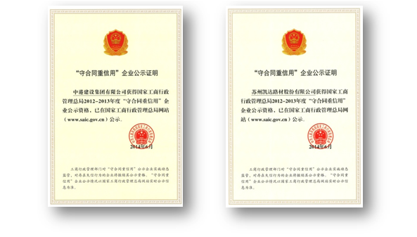 2014年6月,经国家工商行政管理总局对全国所有在册企业进行考评,中港建设集团有限公司及下属公司苏州凯达路材股份有限公司双双被国家工商总局认定为2012-2013年度“守合同重信用”企业称号。近期,中港建设集团有限公司及下属公司苏州凯达路材股份有限公司收到国家工商行政管理总局“守合同重信用”企业荣誉证书。